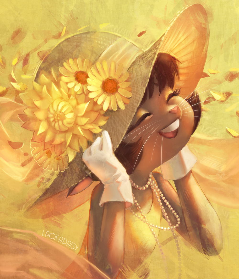 Lackadaisy's resident flapper, Ivy Pepper, dons a sun hat to enjoy the sunshine.