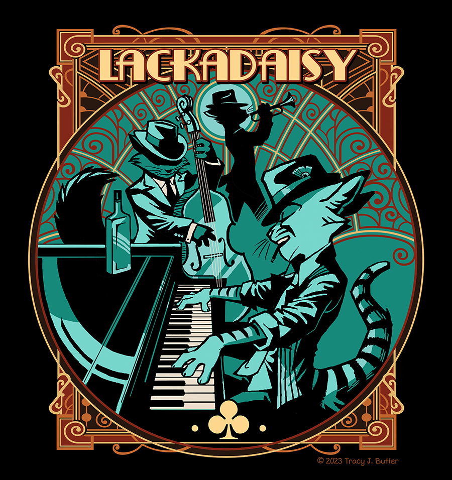 A stylized rendition of Zib, Ben, and Sy playing something jazzy for the speakeasy crowd.